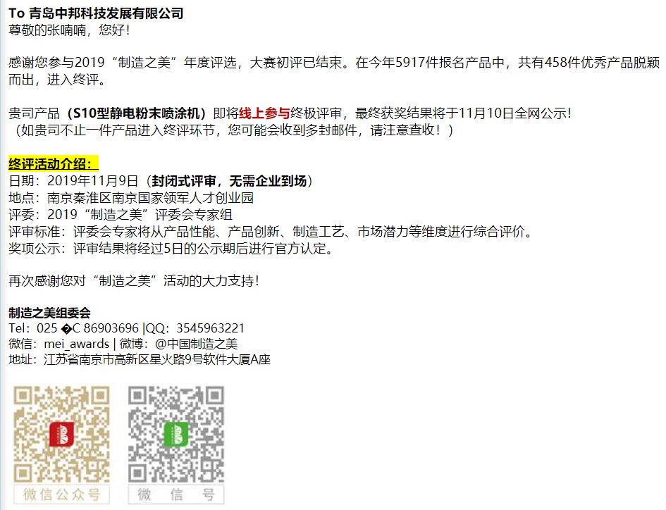 中邦S10型噴涂機(jī)進(jìn)入中國制造之美2019年度大賽終評(píng)!
