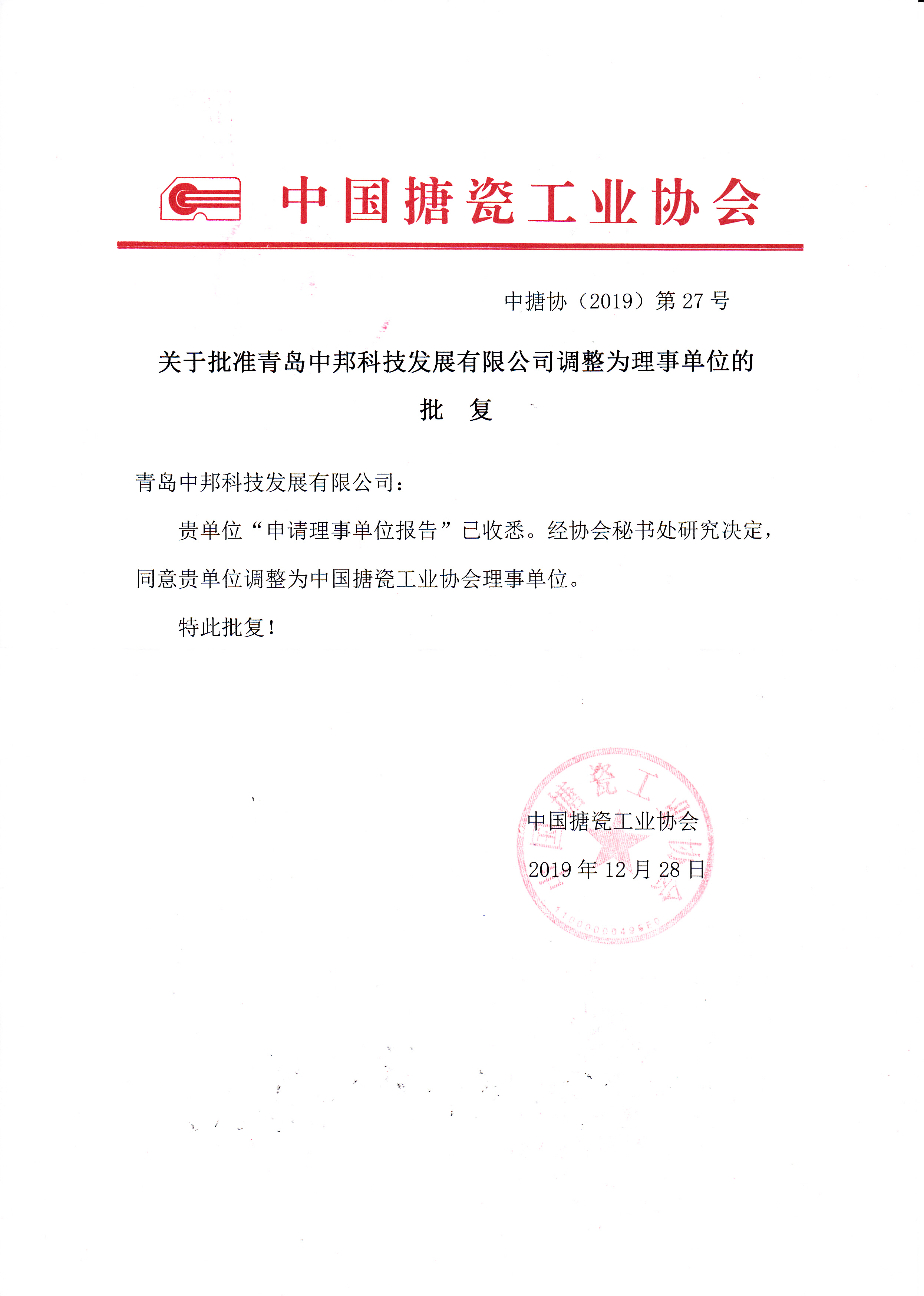 2019年12月28日 中邦獲準(zhǔn)成為中國(guó)搪瓷工業(yè)協(xié)會(huì)理事單位