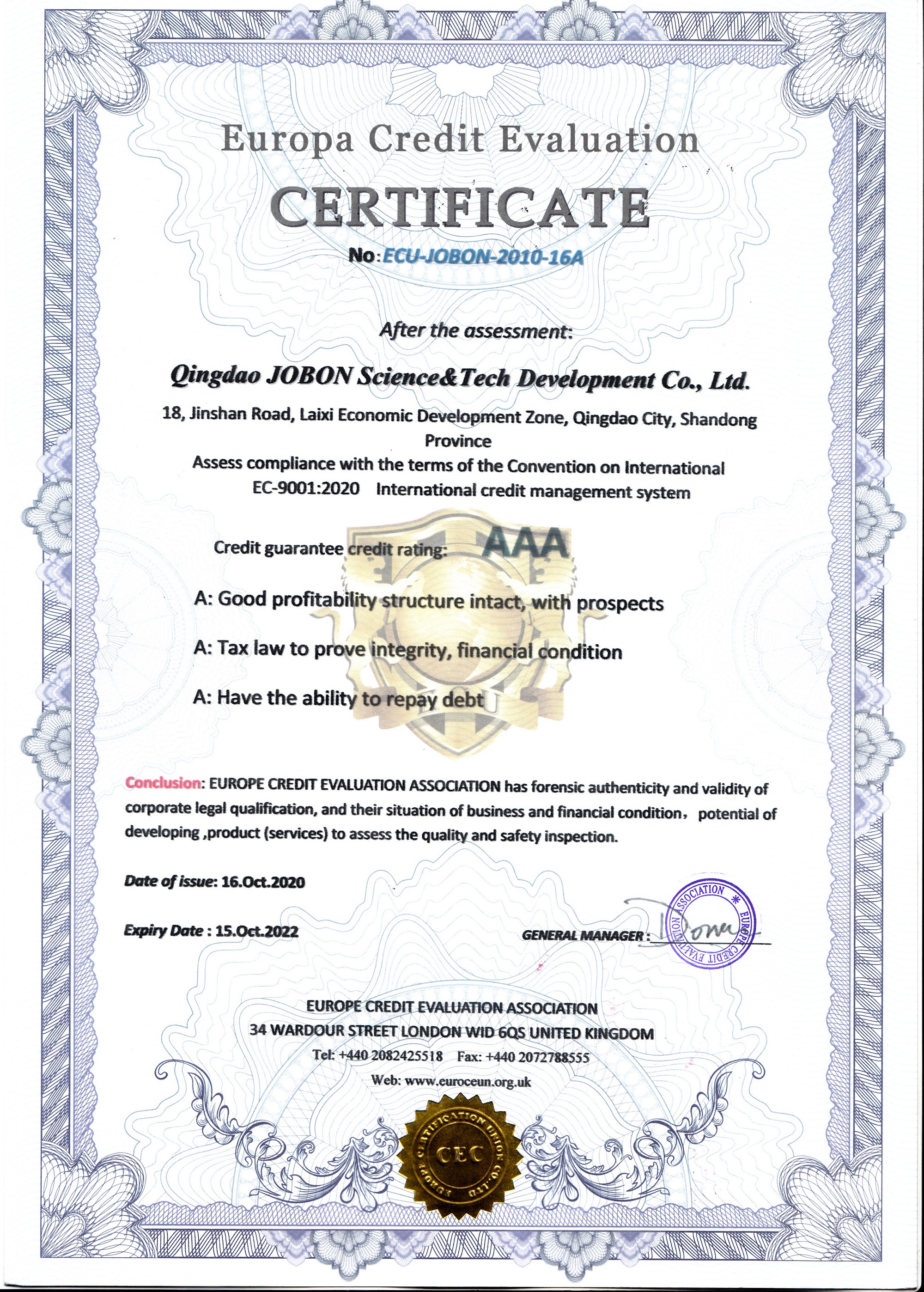 2020年10月 公司通過(guò)歐盟國(guó)際信用管理體系A(chǔ)AA認(rèn)證