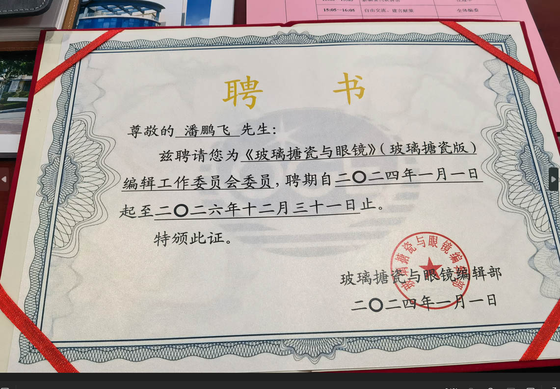 2024年4月,中邦董事長(zhǎng)潘鵬飛被國(guó)家級(jí)學(xué)術(shù)期刊《玻璃搪瓷與眼鏡》聘為編委,主要負(fù)責(zé)靜電搪瓷有關(guān)論文稿件的