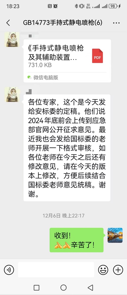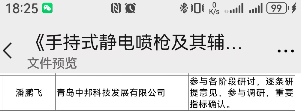 2024年12月6日,中邦董事長潘鵬飛以中國靜電噴涂設(shè)備專家身份參與的國家標準GB14773(關(guān)于靜電噴槍)修訂工作,