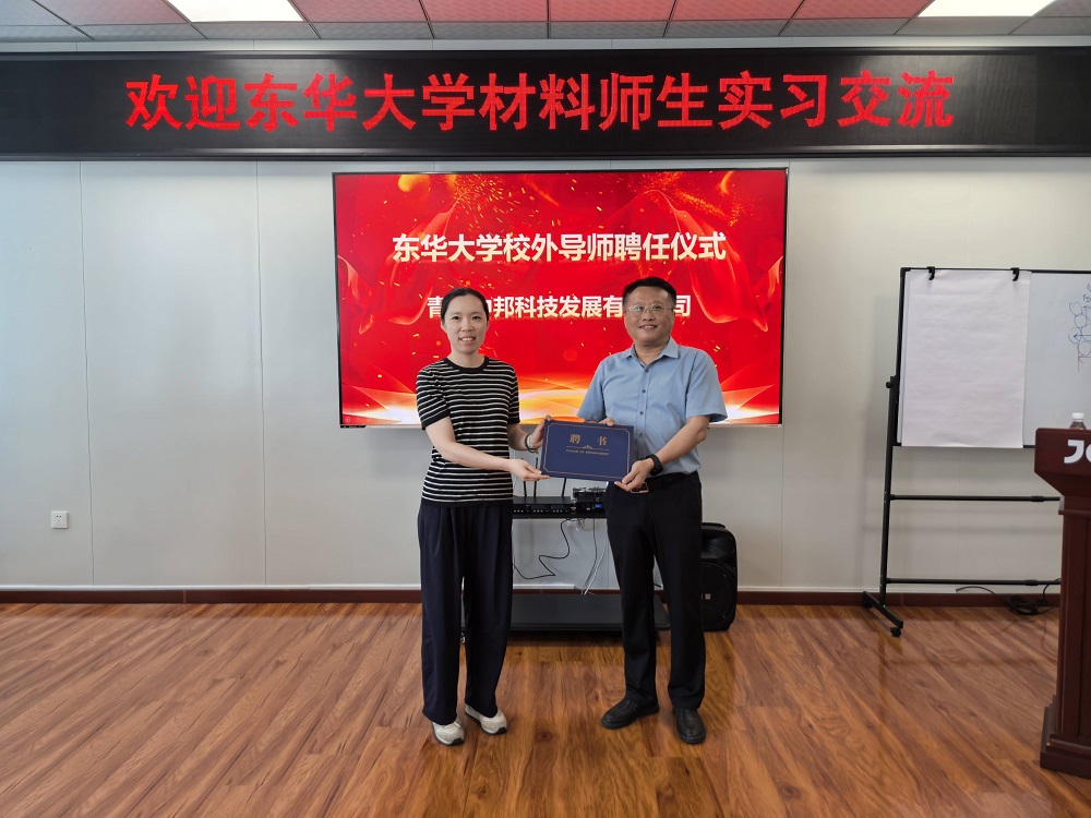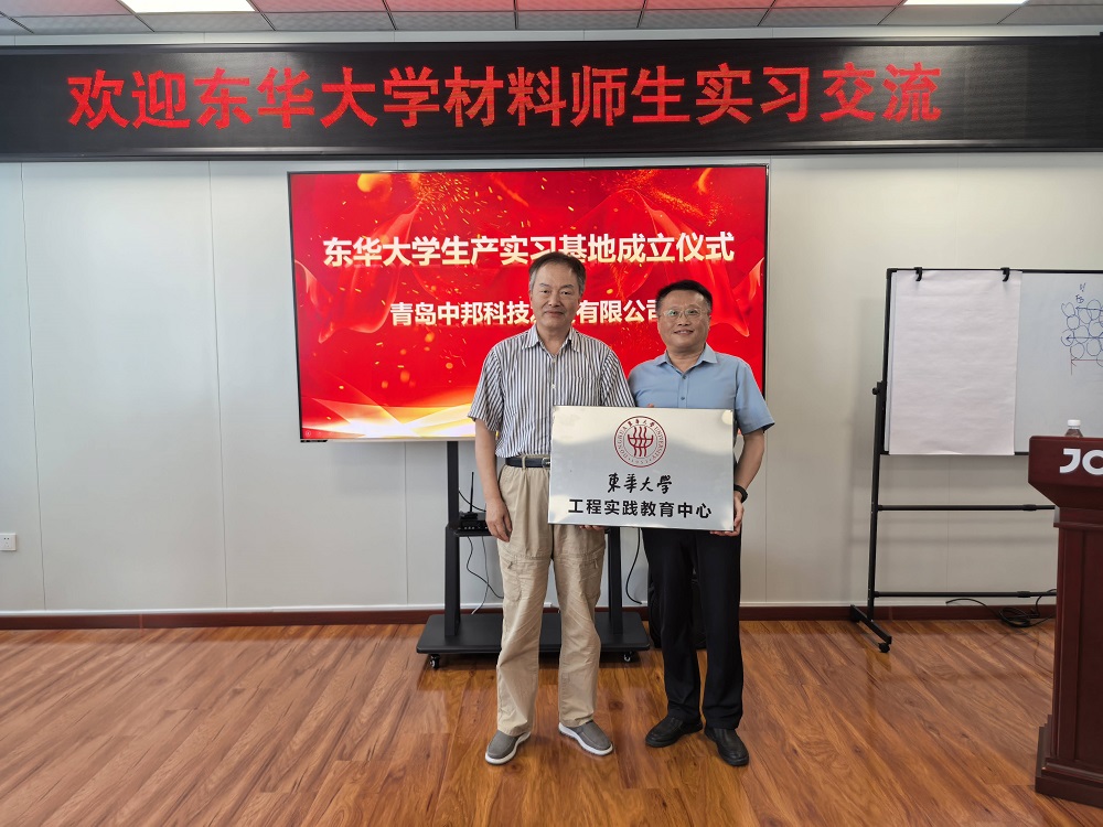 課后東華大學(xué)帶隊(duì)老師蔣偉忠教授、鄭琦博士、周蓓瑩博士、丁林峰博士向中邦頒發(fā)了“東華大學(xué)工程實(shí)踐教育中心”牌匾